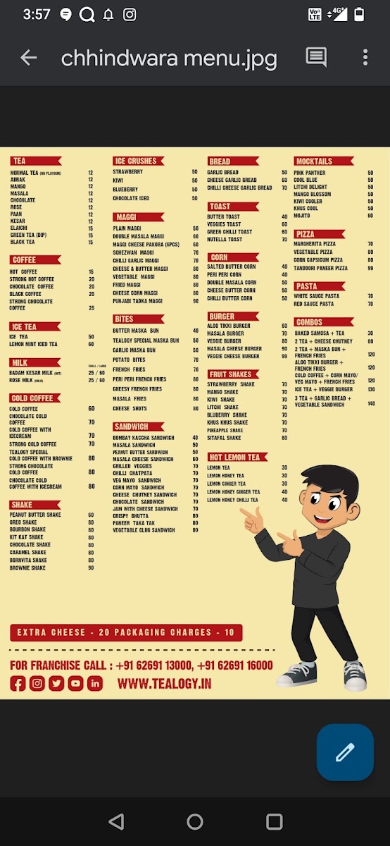 Introducing the menu of TEALOGY, a charming new cafe located on Model Road, in front of Badal Bhoi Museum, Madhya Pradesh. This place is a haven for tea lovers and food enthusiasts alike. Their extensive tea selection includes delightful options like Lemon Honey Ginger Tea and Lemon Honey Chilli Tea, perfectly paired with snacks like Maska Buns and crispy French Fries.